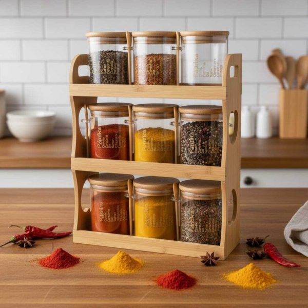 « Rangement 9 pièces -organisateur à boîtes à épices – -ceuilleres en porcelaine -Bambou – 9 boîtes hermétiques – Capacité 400 ml – Écologiques – Design contemporain 27/37 cm