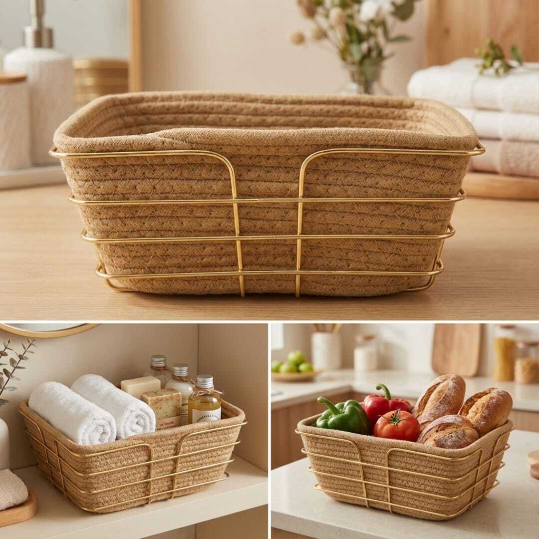 Corbeille à Pain Artisanale lavable – Alliance Corde & Métal Doré inoxidable