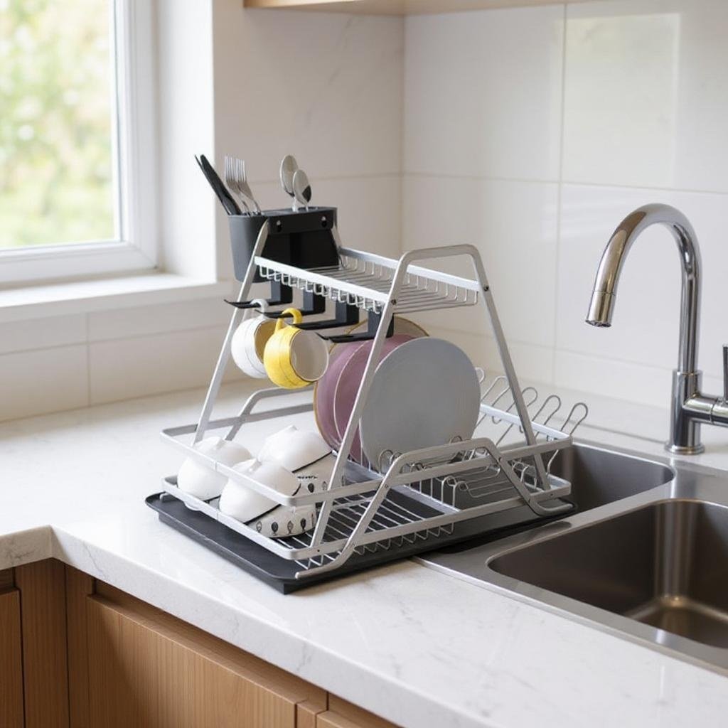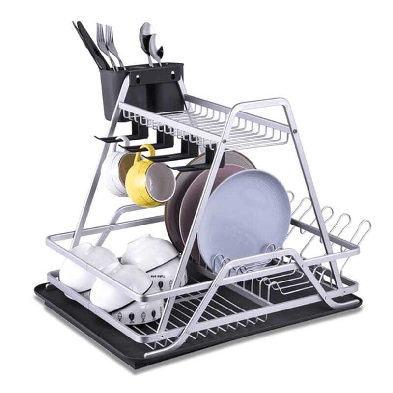 Égouttoir 2 niveaux en amluminum résistant Égouttoir à vaisselle en alluminum resistant inoxidable avec porte couverts – Élégant en noir et argent – Plateau amovible mesures 59cm/38cm/41cm