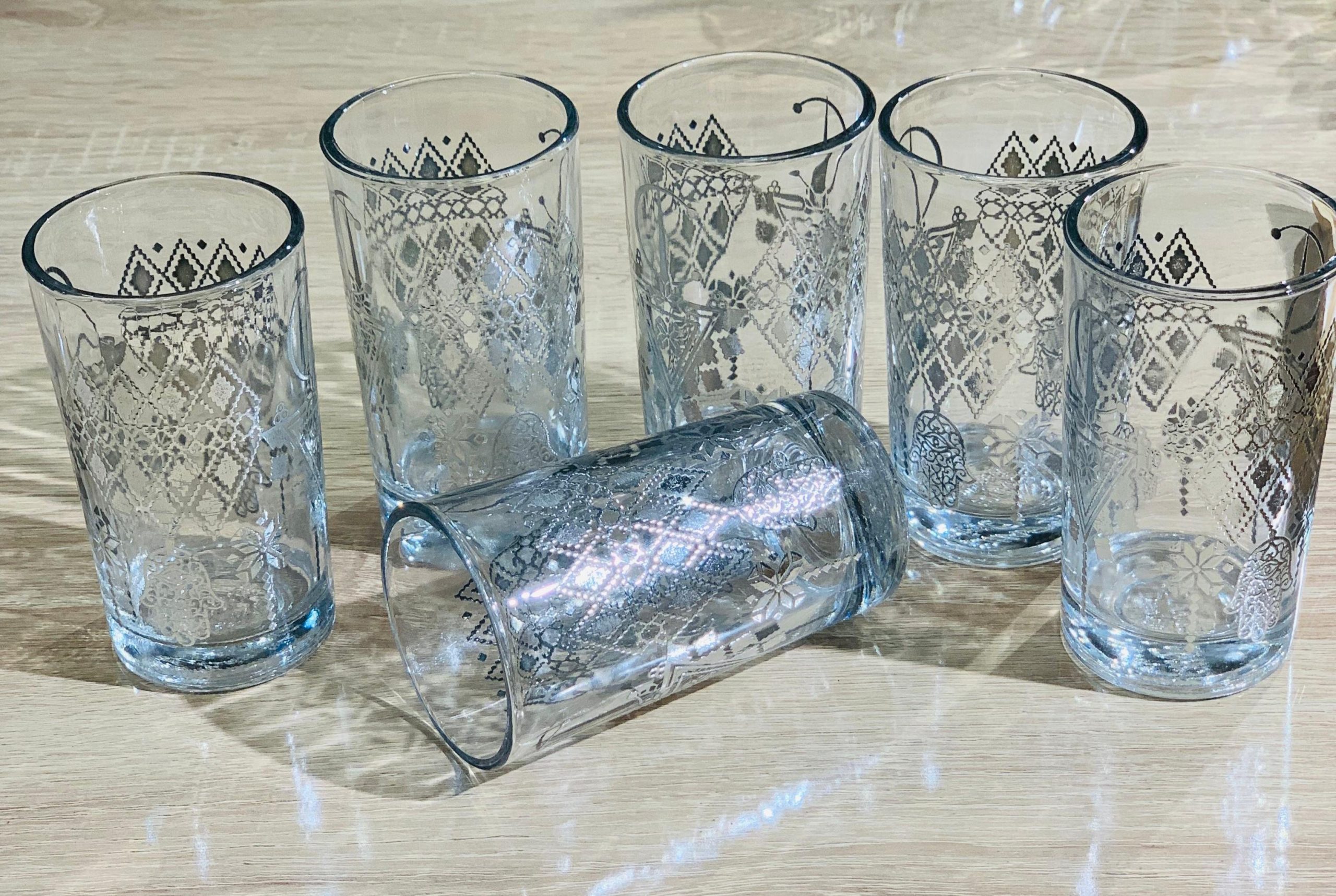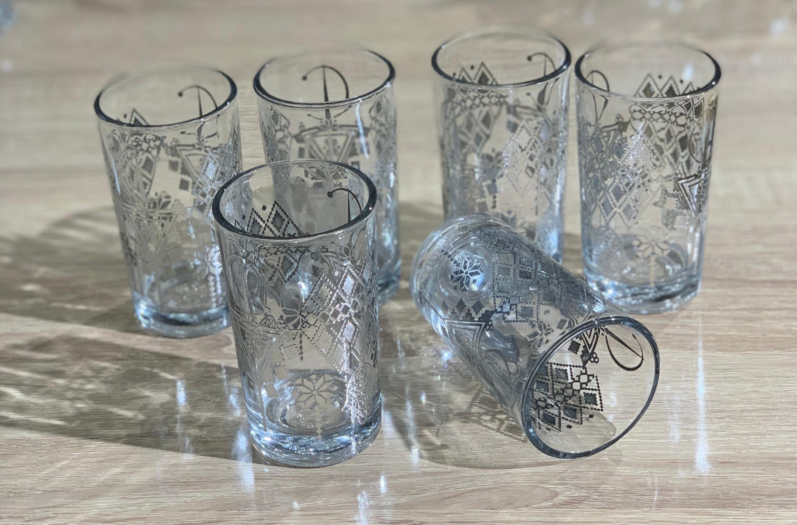 n ensemble raffiné de 12 verres transparents en verre de qualité, décorés de magnifiques motifs géométriques argentés inspirés de l’art islamique traditionnel. Leur finition brillante capte la lumière et crée une ambiance sophistiquée autour de la table.