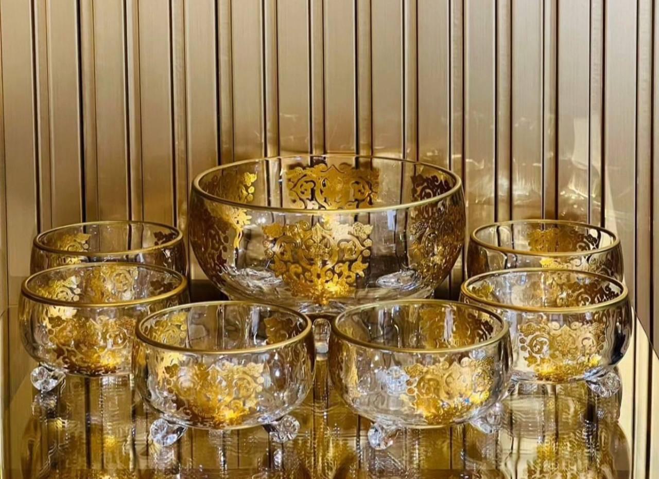 Ensemble Set a Gâteau ou Saladier 7 pièces en Cristal avec détail dore Détail doré