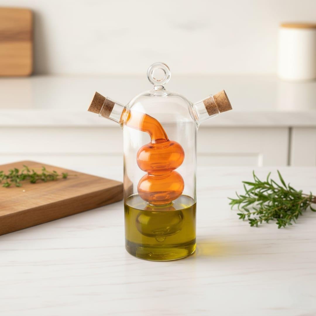 Apportez une touche d’élégance à votre table avec ce huilier double en verre pour huile et vinaigre. Son design ingénieux à deux compartiments permet de conserver et de verser deux liquides différents sans les mélanger. Fabriquée en verre borosilicaté transparent, elle résiste à la chaleur et conserve parfaitement la qualité des huiles et vinaigres. Les bouchons en liège naturel assurent une fermeture hermétique tout en ajoutant une touche rustique. Idéale pour la cuisine ou comme décoration de table raffinée, cette carafe allie praticité et esthétique.