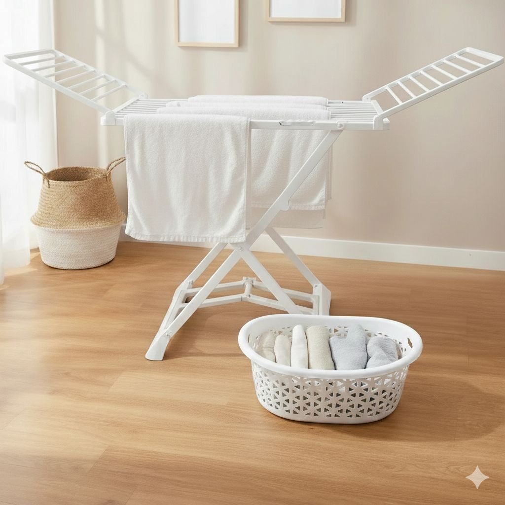 • Stabilité Renforcée : Pieds en X avec base antidérapante pour assurer un maintien parfait même avec des serviettes lourdes.
