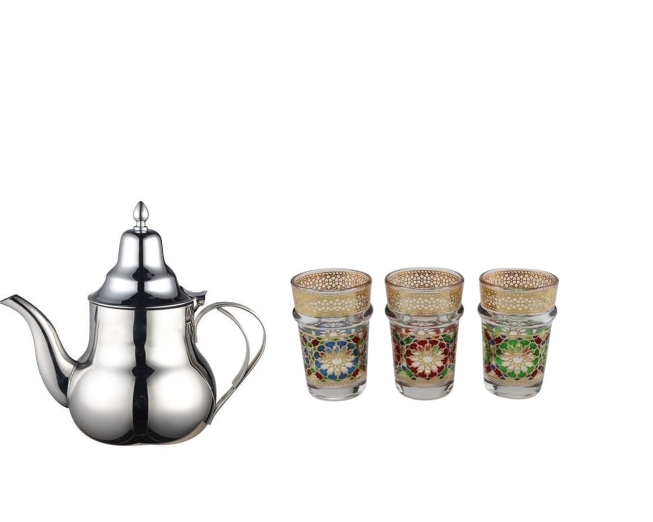« PACK THEIRE ET 12 VERRES A THE IDEE CADEAUX -un service à thé marocain, composé d’une théière en inox 1,4 l et de 12 verres à thé décorés, en cristallin .