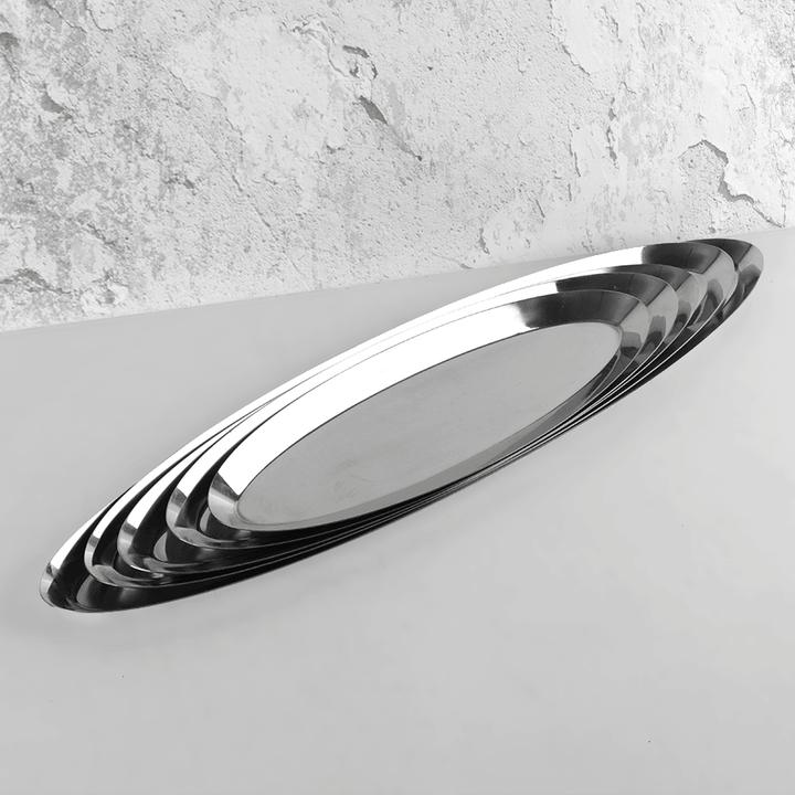 • Ce plat ovale en INOX argenté, aux dimensions élégantes et majestueuses