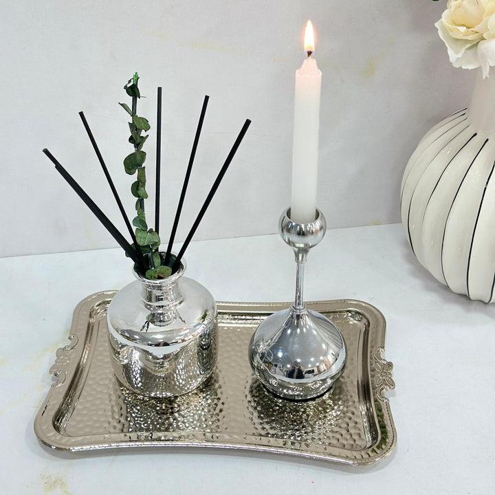 - Plateau rectangulaire en métal argenté, mesurant environ 25 cm de longueur et 17 cm de largeur.