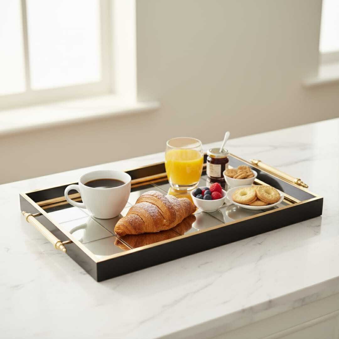 Ce magnifique plateau rectangulaire en miroir avec bords noirs et finitions dorées apporte une touche de luxe à votre intérieur. Fabriqué avec des matériaux de qualité, il mesure 50 x 30 cm, idéal pour servir le café, le thé ou pour exposer vos bougies, parfums ou accessoires décoratifs. Sa surface réfléchissante ajoute de la luminosité et de l’élégance à toute pièce. Parfait comme idée cadeau raffinée ou comme élément décoratif sur une table basse, une coiffeuse ou un buffet. Un accessoire chic et fonctionnel pour sublimer votre espace.