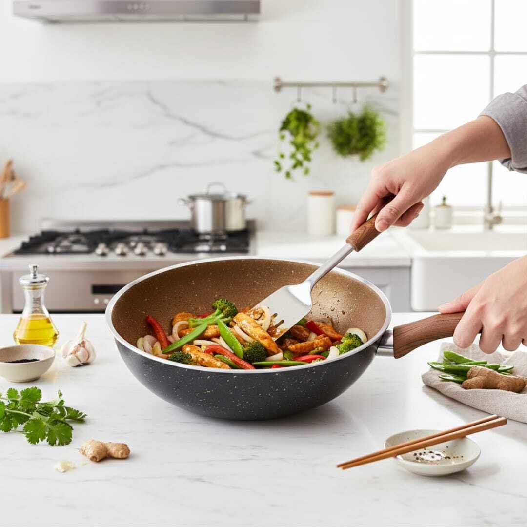 « Poêle Wok 2 en 1 -Induction Anti Adhésif granit haute qualité -Tous Feux Diametre 28cm Avec Poignée en bois -Revêtement Résistant-batterie professionnelle