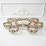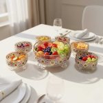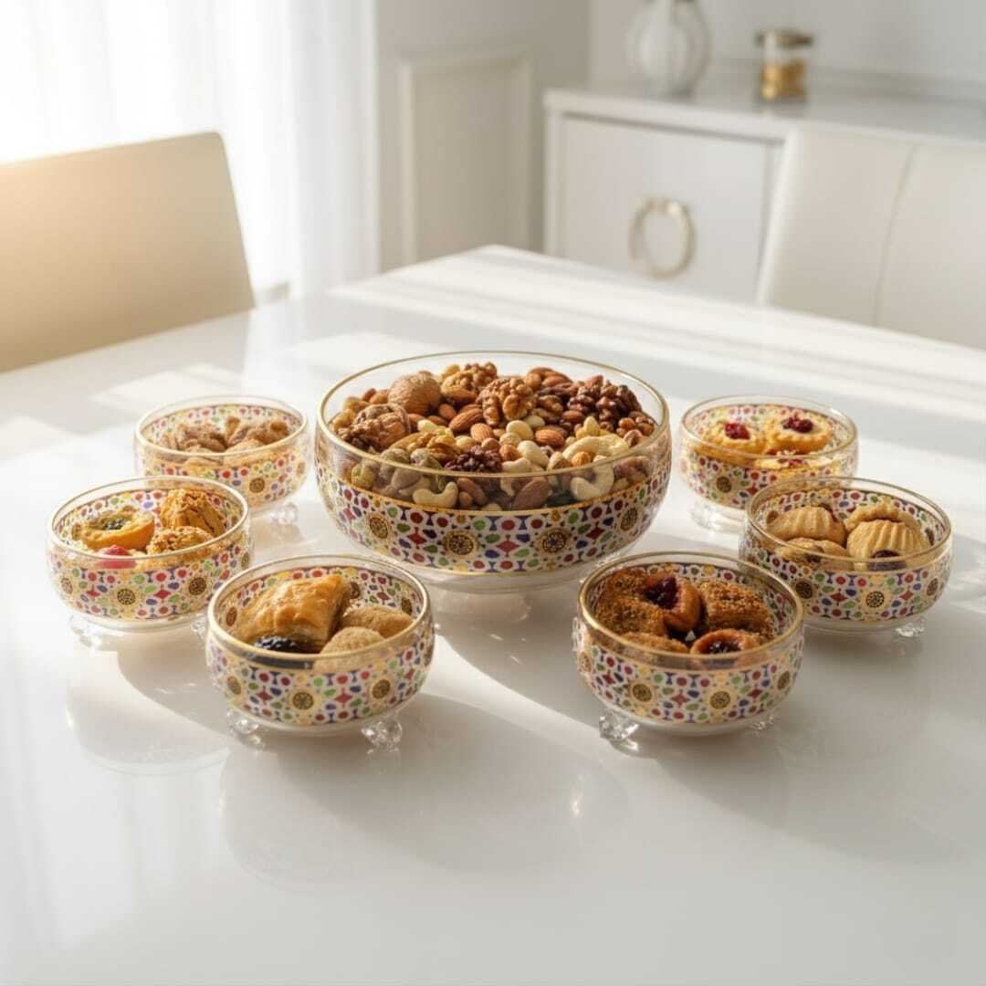 Ce magnifique service de bols en verre transparent avec décor multicolore apporte une touche de gaieté et d’originalité à toutes les tables. Fabriqué à partir de verre épais et résistant, il se compose d’un grand bol central accompagné de six petits bols assortis, parfaits pour présenter des desserts, des salades fraîches, des fruits, ou même des apéritifs.