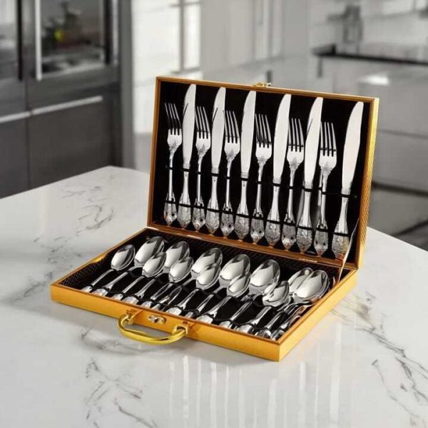 Le prix initial était : 399,00Dhs.299,00DhsLe prix actuel est : 299,00Dhs.Menagere inox – 24 couverts en inox décorés pour une table élégante Coffret de luxe idee cadeau
